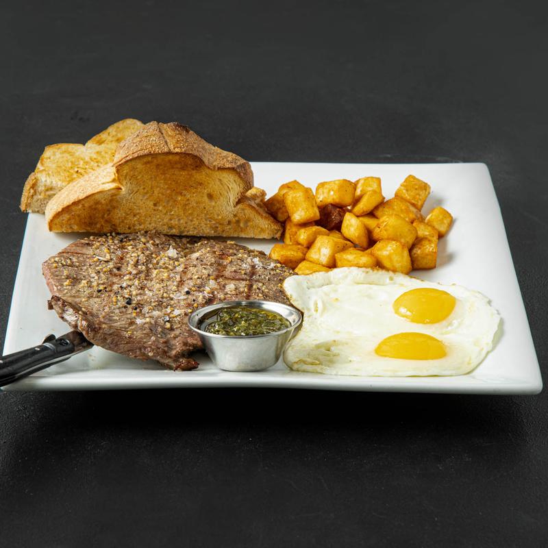 10oz char-broiled beef flank steak served with potatoes, chimichurri sauce, two eggs, and toast.